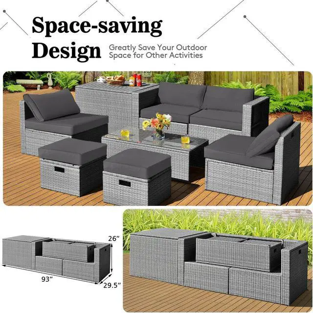 Space-saving Design: Different from the common outdoor furniture sets, this outdoor conversation set can be stored in a compact size that is 93" x 29.5" x 26" (L x W x H) in dimension. Therefore, it is able to greatly save your outdoor space when out of use.