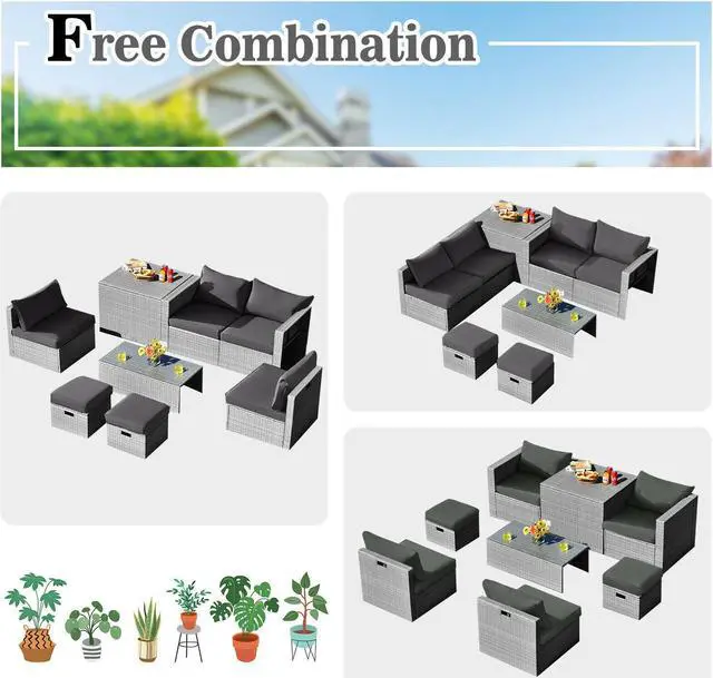 -Package includes: 1 x Table, 1 x Storage box, 1 x Waterproof cover, 2 x Ottomans, 2 x Corner sofas, 2 x Armless sofas, 2 x Ottoman cushions, 4 x Back cushions, 4 x Seat cushions, 1 x Instruction