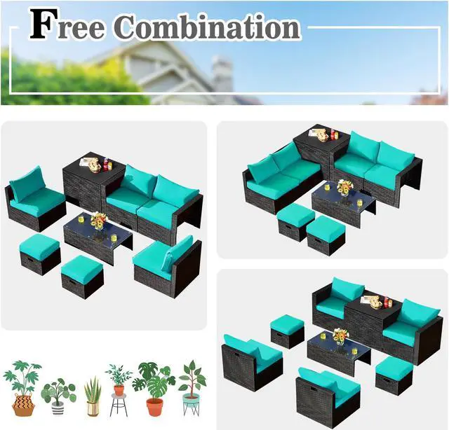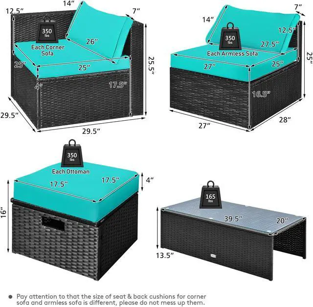 Comfy Cushions: Each ottoman, armless sofa and corner sofa are equipped with soft and thick cushions for optimal comfort. When you put legs on the ottomans, the ottomans cushions will not slip away because of fixing ropes and buttons. Besides, all the cushion covers can be removable for easy cleaning. Please note that the dimensions of the back and seat cushions of the armless sofa and corner sofa are different, do not mess them up. Take cushions inside if it rains.