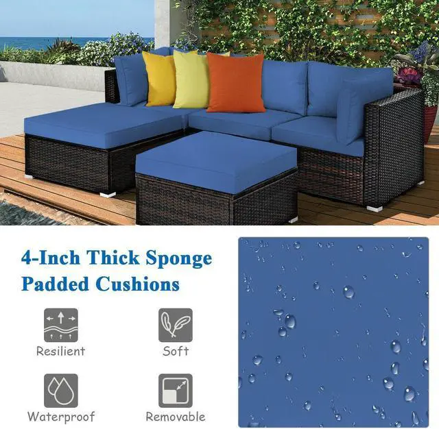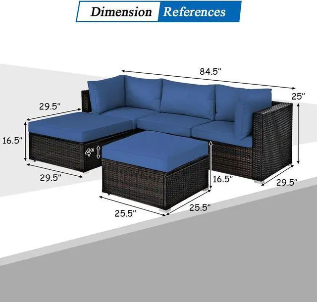 Easy to Assemble and Dimensions: Coming with all the necessary parts and hardware, it is simple to assemble the rattan sofa set. Corner sofa size: 29.5" (L) x 29.5"(W) x 25"(H), armless sofa size: 29.5" (L) x 25.5"(W) x 25"(H), large ottoman size: 29.5" (L) x 29.5"(W) x 12.5"(H), small ottoman size: 25.5" (L) x 25.5"(W) x 12.5"(H).