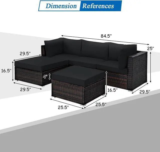 Easy to Assemble and Dimensions: Coming with all the necessary parts and hardware, it is simple to assemble the rattan sofa set. Corner sofa size: 29.5" (L) x 29.5"(W) x 25"(H), armless sofa size: 29.5" (L) x 25.5"(W) x 25"(H), large ottoman size: 29.5" (L) x 29.5"(W) x 12.5"(H), small ottoman size: 25.5" (L) x 25.5"(W) x 12.5"(H).