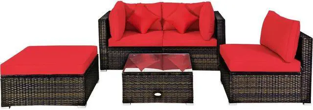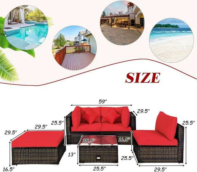 Dimensions of 5 Pcs Rattan Set: Corner sofa size: 29.5'' (L) x 29.5'' (W) x 25.5'' (H), armless sofa size: 29.5'' (L) x 25.5'' (W) x 25.5'' (H), ottoman size: 29.5'' (L) x 29.5'' (W) x 16.5'' (H), coffee table size: 25.5'' (L) x 25.5'' (W) x 13'' (H). Weight capacity of each sofa: 360 lbs, weight capacity of table: 110 lbs.
