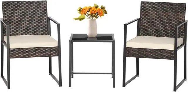 Compact in Size: This 3-piece patio conversation set contains 1 table (18"L x 18"W x 19"H) and 2 armchairs (23"L x 21"W x 32"H), which will transform your limited places (porch and balcony) into a cozy and leisure zone for outdoor relaxation and enjoyment. Please refer to the size instructions before purchasing to avoid unnecessary trouble.