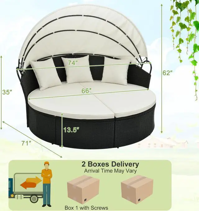 Applicable Scenarios: This elegant and functional rattan sofa bed will be a perfect choice for you relax outdoors. It will a nice addition to multiple occasions like backyard, poolside and so on. Overall dimension: 74" x 71" x 62" (L x W x H).