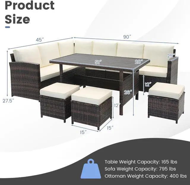 Elegant Design for Wide Use: Apart from its practicality, the mixed brown rattan showcase elegance, making it a welcome addition to your poolside, garden and balcony. The sofa size: 45" x 25" x 27.5"; the table size: 51" x 28" x15.5" ; the ottoman size: 15" x 15" x 12".