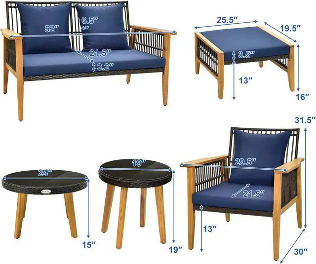 Product Dimensions: Dimension of single chair: 29.5" x 30" x 31.5" (L x W x H). Dimension of loveseat: 52" x 30" x 31.5" (L x W x H). Dimension of ottoman: 25.5" x 19.5" x 16" (L x W x H). Dimension of large coffee table: 24" x 15" (Dia x H). Dimension of small coffee table: 19" x 19" (Dia x H).