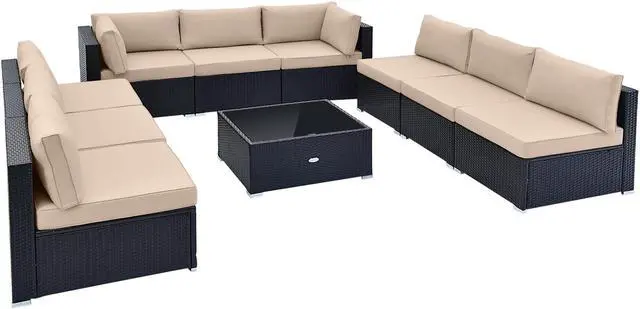 Elegant and Durable Sofa Set: The patio sofa set also boasts well-woven brown PE rattan which is both elegant and built-to-last. And all the 10 pieces are quite sturdy with reinforced metal frame and L-shaped footpads.