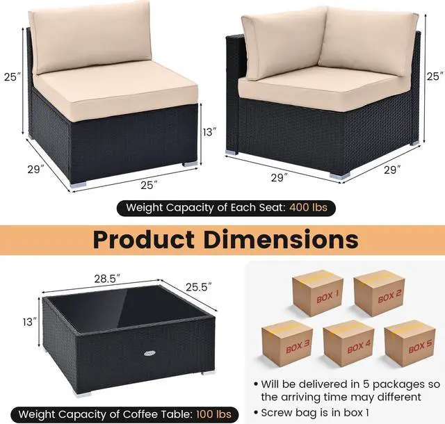 About Installation: The clear instruction will help you finish the assembly more efficiently. Please do not tighten all the screws until all the holes are aligned. Dimension of armless sofa: 29" x 25" x 25" (L x W x H). Dimension of corner sofa: 29" x 29" x 25" (L x W x H). Dimension of coffee table: 28.5" x 25.5" x 13" (L x W x H).