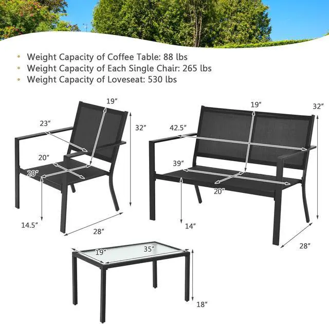 About Dimension: Dimension of coffee table: 35" x 19" x 18" (L x W x H), dimension of each chair: 28" x 23" x 32" (L x W x H), dimension of loveseat: 28" x 42.5" x 32" (L x W x H), weight capacity of coffee table: 88 lbs, weight capacity of each chair: 265 lbs. weight capacity of loveseat: 530 lbs.