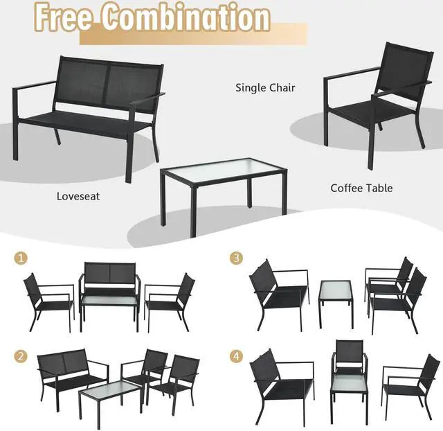4 Pieces Garden Bistro Set: Equipped with a convenient coffee table, a large loveseat and 2 ergonomic chairs, this outdoor conversation set is comfortable and practical, so you can use it to entertain your guests or friends, sharing the happy moments and enjoying fresh air together.