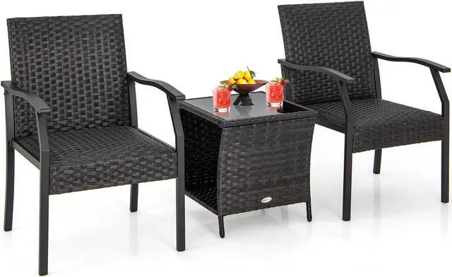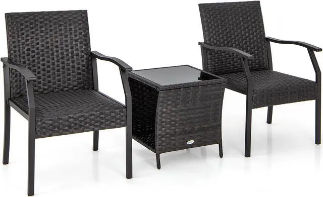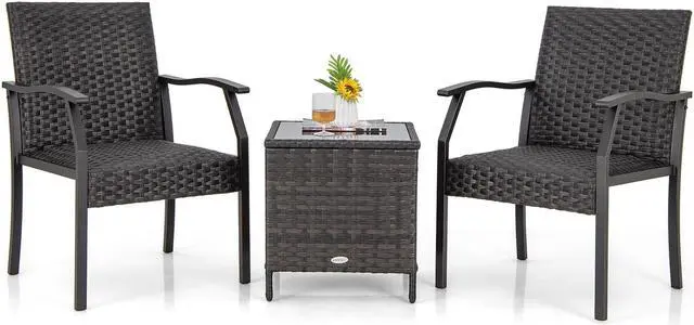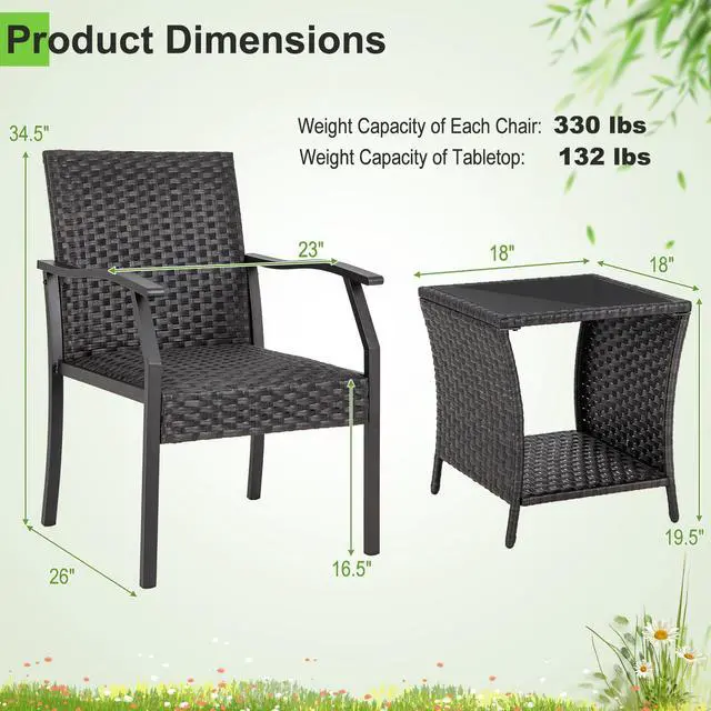 Simple Assembly: Coming with clear instructions and all necessary accessories, this 3-piece patio rattan set can be assembled with higher efficiency. Dimension of each chair: 26" x 23" x 34.5" (L x W x H). Dimension of the coffee table: 18" x 18" x 19.5" (L x W x H).