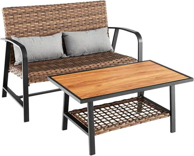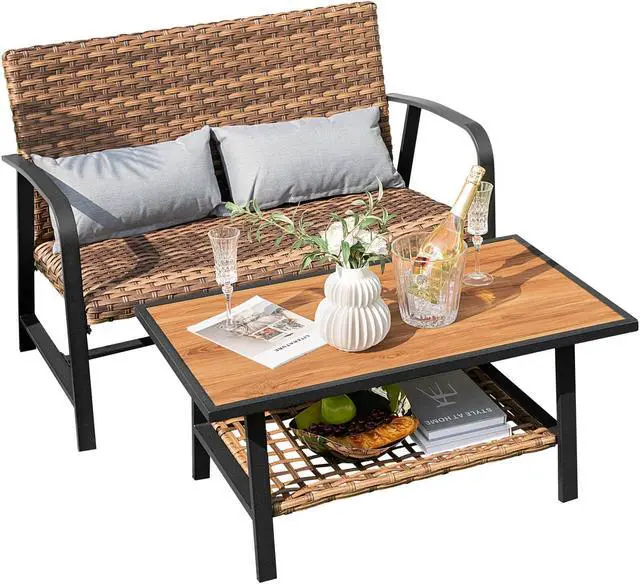 More Applicable Places: Measuring 39" x 22" x 18" (L x W x H) in table dimension and 47" x 28" x 34" (L x W x H) in loveseat dimension, this 2-piece outdoor furniture set is suitable for different places whether they are gardens, decks, backyards or poolsides. Note: please do not tighten all the screws until all the holes are aligned while assembling.