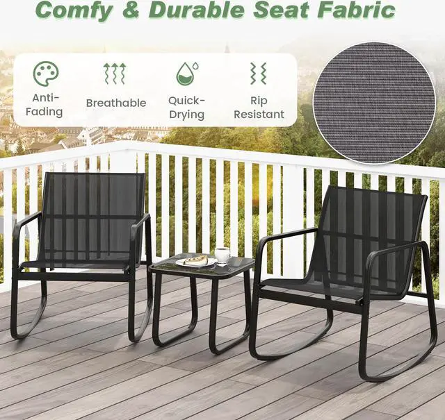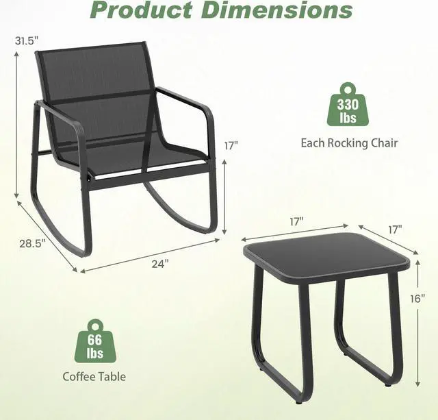 Ideal Relaxing Choice: This sturdy and safe 3-piece patio rocking set will be a nice option for outdoor relaxation. Whether in backyard, poolside or balcony, it will always allow you to enjoy comfort and ease.