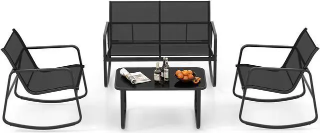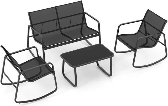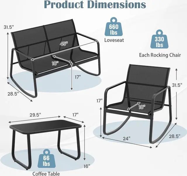 Ideal Relaxing Choice: This sturdy and safe 4-piece patio rocking set will be a nice option for outdoor relaxation. Whether in the backyard, poolside or balcony, it will always allow you to enjoy comfort and ease.