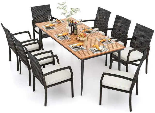Spacious 9-Piece Dining Set: Host unforgettable outdoor meals with this expansive patio set that includes 1 large dining table and 8 comfortable chairs. Generously sized to accommodate 8 guests, it's perfect for backyard BBQs, family feasts, or festive alfresco celebrations.