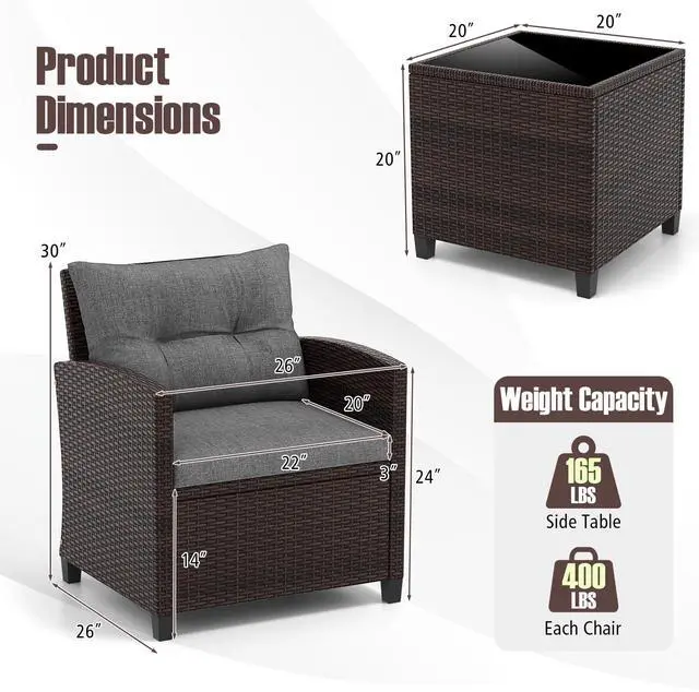 Quick Assembly & Compact Size: All hardware and instructions are included for easy setup. Chair Dimensions: 26.5" x 26.5" x 30" (L x W x H), weight capacity: 360 lbs. Table Dimensions: 19.5" x 19.5" x 19.5" (L x W x H), weight capacity: 70 lbs.