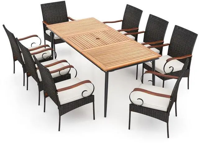 Elegant Acacia Wood Tabletop: The large dining table features a durable acacia wood surface with a built-in 2" umbrella hole for shaded comfort. Pair it with your favorite umbrella (umbrella base not included) to enjoy meals rain or shine.