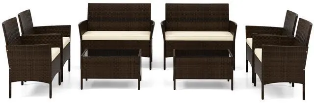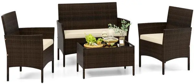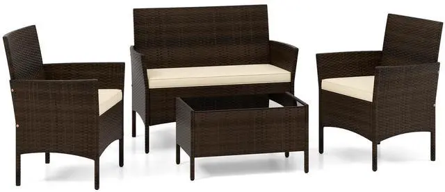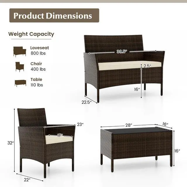 Versatile Outdoor Style: With a compact yet comfortable footprint, this 4-piece rattan set is perfect for patios, balconies, gardens, or poolside retreats. Dimensions Loveseat: 39.5" x 22.5" x 32"; Chairs: 23" x 22" x 32"; Table: 28" x 16" x 16" (L x W x H).