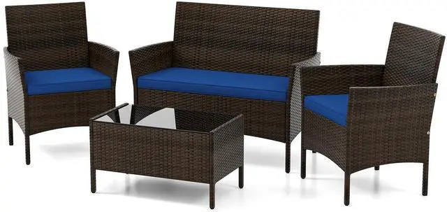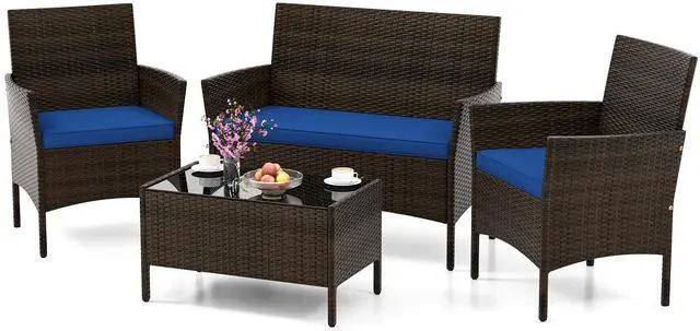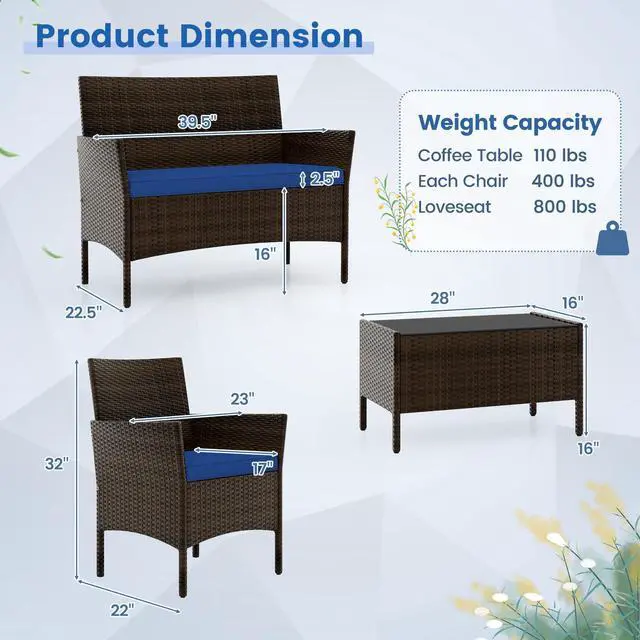 Versatile Outdoor Style: With a compact yet comfortable footprint, this 4-piece rattan set is perfect for patios, balconies, gardens, or poolside retreats. Dimensions Loveseat: 39.5" x 22.5" x 32"; Chairs: 23" x 22" x 32"; Table: 28" x 16" x 16" (L x W x H).