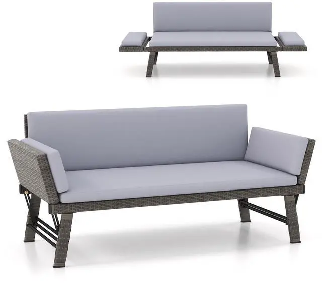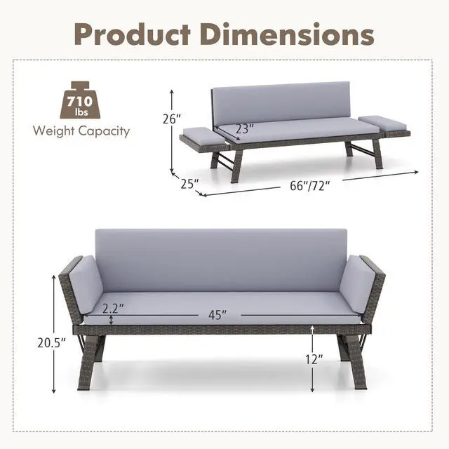 Fits Any Outdoor Setting: Whether placed on a balcony, porch, backyard, or poolside, this convertible daybed adds comfort and sophistication to any space. Dimensions (Daybed): 66"/72"L x 25"W x 26"H; Dimensions (Loveseat): 51"L x 25"W x 26"H.