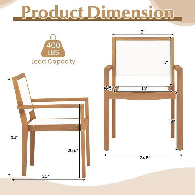 Space-Saving Stackable Design: These outdoor dining chairs feature a compact, stackable structure for effortless storage and efficient use of spaceideal for patios, balconies, and smaller garden areas. Chair Dimensions: 25" x 24.5" x 34" (L x W x H); Seat Height: 18".