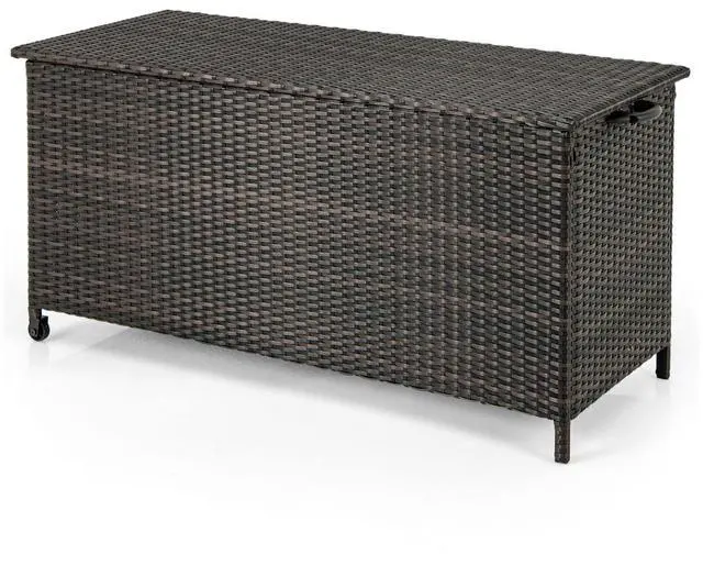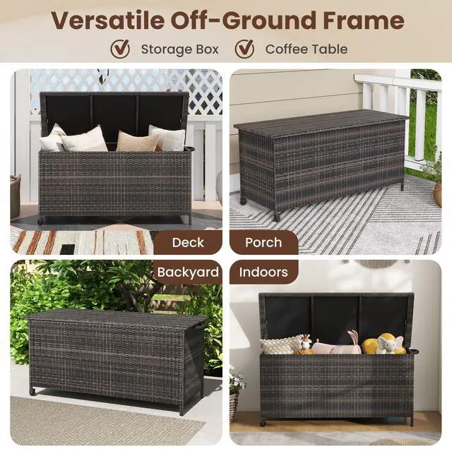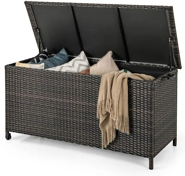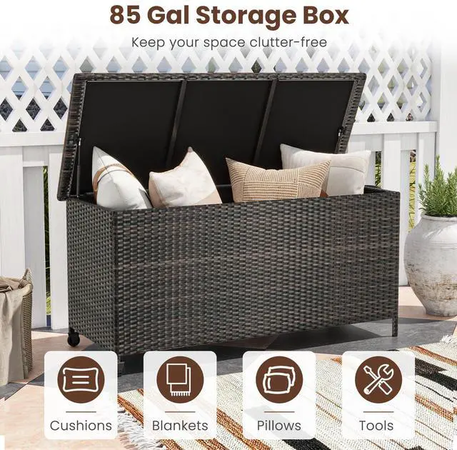 Description: 85 gal storage box for storing your cushions blankets pillows tools and moreMade of sprayed metal making it anti-deformation and enduringThe selected PE rattan is anti-fading sun-proof and elegantThe labor-saving gas strut provides firm support to the lidThe removable 160g polyester liner comes with hook and loop fastenersPerfect outdoor addition with waterproof top and bottom panelsVersatile off-ground frame for your deck porch backyard and morePull to move the deck box which is designed with a side handleComes with 2 universal wheels that are smooth and wear-proofFeatures dual strong legs to ensure easy and stable stoppingSuitable for 14 cushions that measure 25.5" x 20" x 3" (L x W x H)