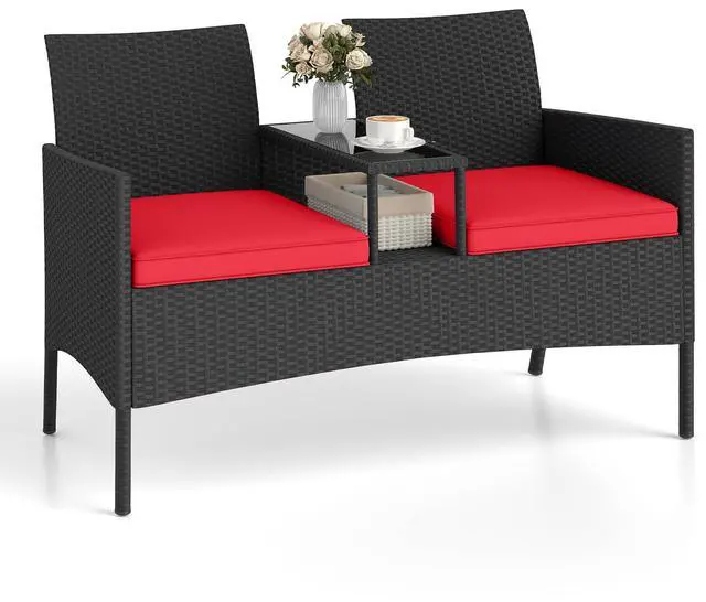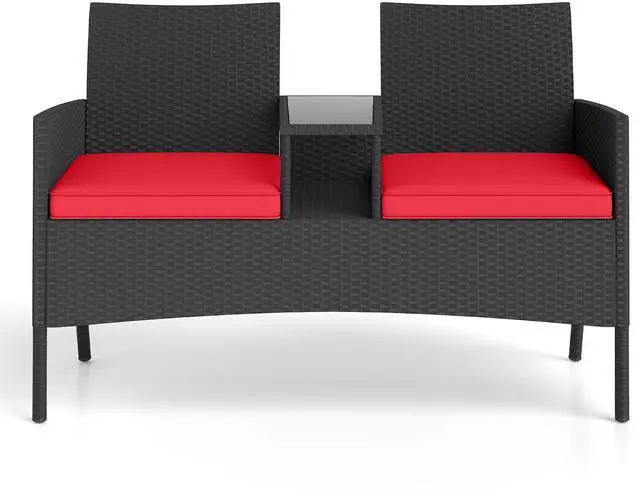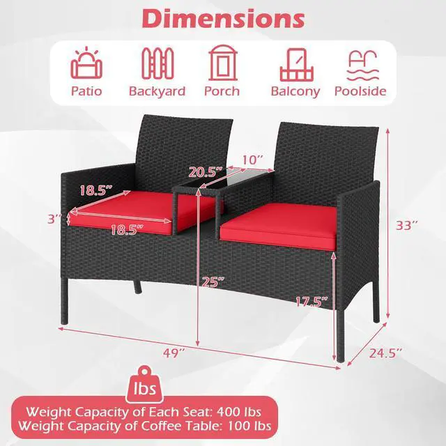 2-Seat Outdoor Loveseat with Table: Designed with two connected seats and a center tableperfect for enjoying drinks, snacks, or reading on your porch, patio, or backyard.