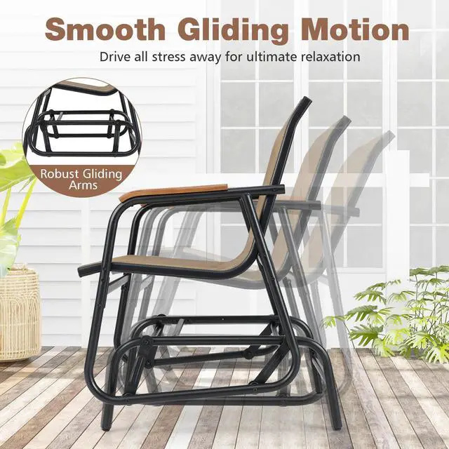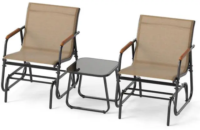 Description: �Smooth gliding system allows you to enjoy your leisure time�Premium seat fabric is breathable quick-drying and wear-resistant�Ergonomic back and seat for superior comfort�Teak wood armrests add a touch of natural beauty�Robust metal frame with strong rocker arms for reliable support�Patio side table keeps everything you need within easy reach�Tempered glass tabletop is easy to clean and anti-scratch�Bottom suction cups for easy disassembly and cleaning of tabletop�Rounded corners for a safer and more comfortable use�Adjustable foot pads for leveling on slightly uneven surfaces�Suitable for backyard garden porch balcony poolside etc. �Please avoid rain exposure for prolonged service life�Assembly is required before use
