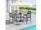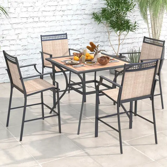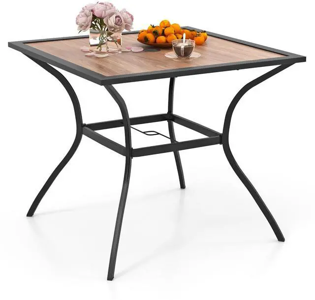 Description: Wooden-like tabletop for anti-fading and heat-resistant useHeavy-duty metal frame contributes to the overall sturdiness 1.57" top umbrella hole fits various umbrellas (not included) Middle umbrella hole adds stability and avoids tipping overAccommodate up to 4 people with a spacious tabletopCurved supporting legs with anti-slip foot pads for steadinessIdeal complement for your patio garden backyard poolside etcElegant design injects a timeless touch for your outdoor living space