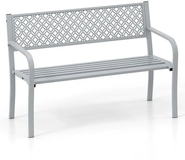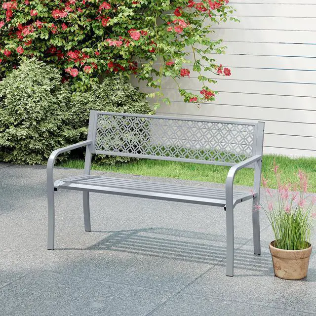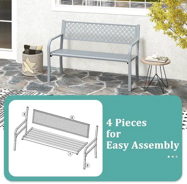 Description: Ensure stable and reliable support with sturdy metal constructionCome with a strong loading capacity of up to 790 poundsThe anti-slip foot pads ensure additional stabilityAdd a modern and sophisticated touch with a geometric lattice patternRoom for 2-3 people perfect for hosting small gatheringsInclined backrest curved armrests and contoured seat for optimal comfortEnsure breathability thanks to its hollowed backrest and slatted seatSuitable for porch patio garden and backyardPlease avoid rain exposure for prolonged service life4 pieces for easy assembly