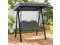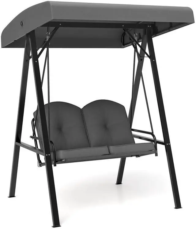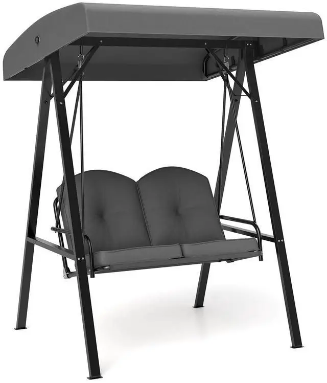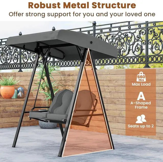 Instruction Description: Adjustable canopy offers protection against sunlightWide sitting area is perfect for 2 people to relax togetherSoft and elastic cushions offer much comfortTufted design of back cushions for more eleganceSolid A-shaped metal frame for high stabilityMesh seat fabric is breathable and cozyNon-slip footpads make the porch swing stablerStrong spring hooks firmly hold the swing chairIdeal for poolside backyard balcony and so onAssembly is requiredInstallation guide
