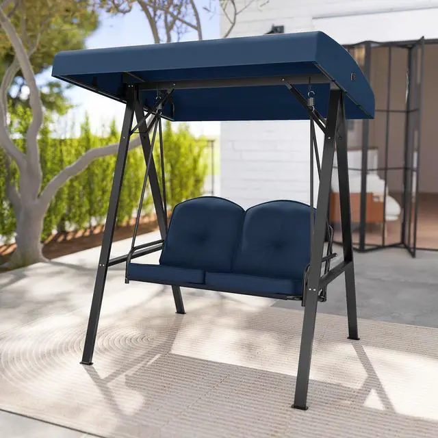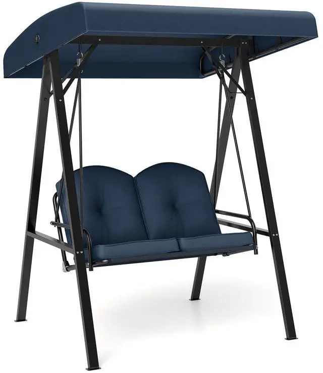 Instruction Description: Adjustable canopy offers protection against sunlightWide sitting area is perfect for 2 people to relax togetherSoft and elastic cushions offer much comfortTufted design of back cushions for more eleganceSolid A-shaped metal frame for high stabilityMesh seat fabric is breathable and cozyNon-slip footpads make the porch swing stablerStrong spring hooks firmly hold the swing chairIdeal for poolside backyard balcony and so onAssembly is requiredInstallation guide
