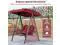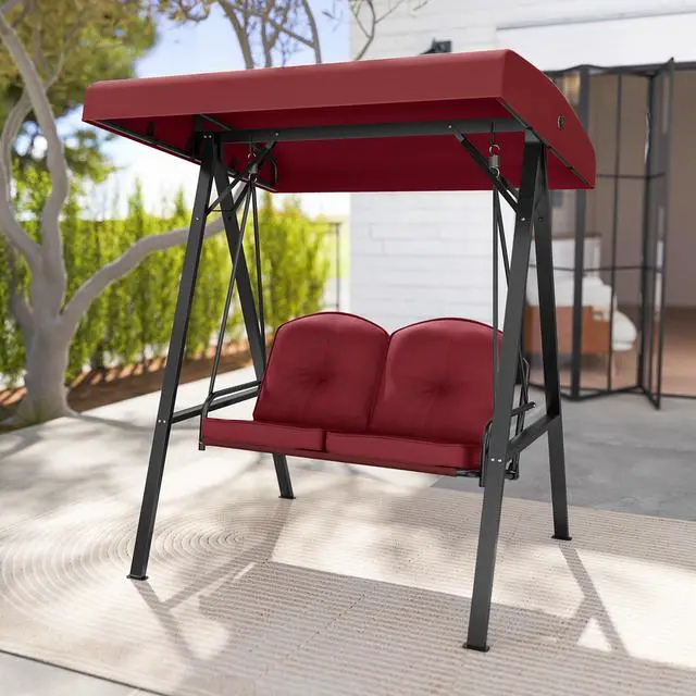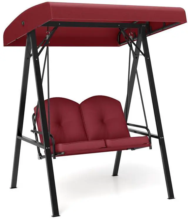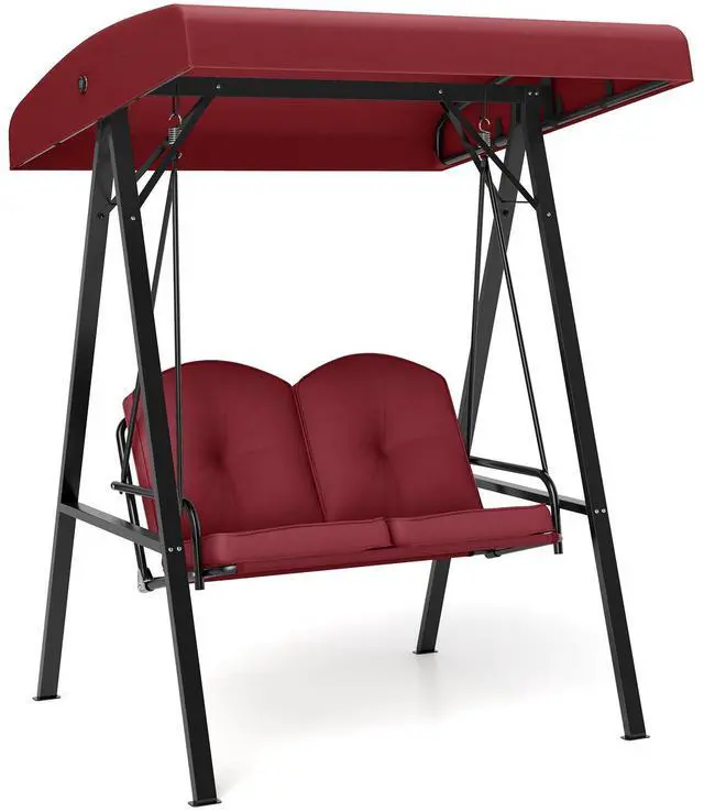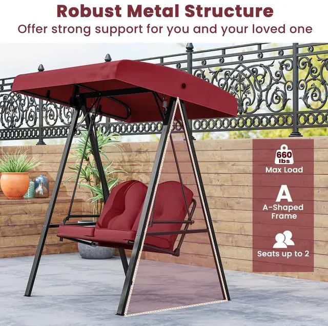 Instruction Description: Adjustable canopy offers protection against sunlightWide sitting area is perfect for 2 people to relax togetherSoft and elastic cushions offer much comfortTufted design of back cushions for more eleganceSolid A-shaped metal frame for high stabilityMesh seat fabric is breathable and cozyNon-slip footpads make the porch swing stablerStrong spring hooks firmly hold the swing chairIdeal for poolside backyard balcony and so onAssembly is requiredInstallation guide