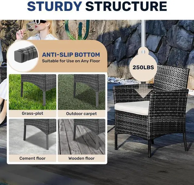 Weather resistant: No worry to split, crack, fade, rot and deteriorate. This patio set features a high-quality tempered glass top to wear resistance. All-weather rattan ensures durability to outdoor elements like sunlight, water and abrasion
