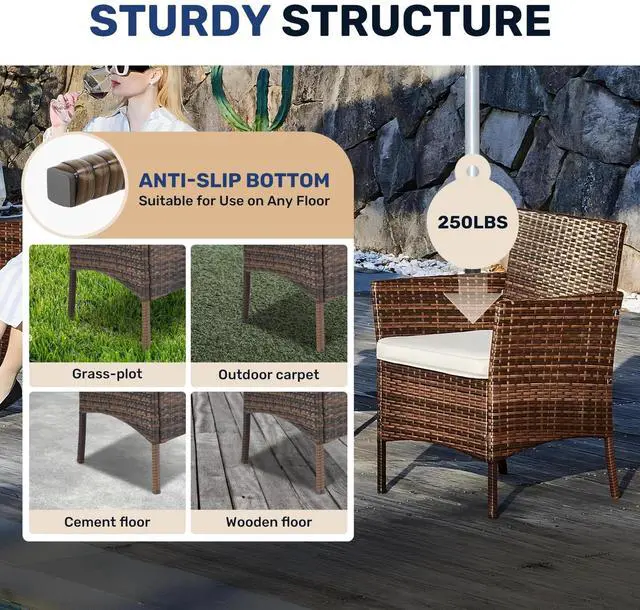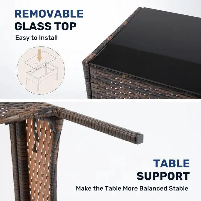 Weather resistant: No worry to split, crack, fade, rot and deteriorate. This patio set features a high-quality tempered glass top to wear resistance. All-weather rattan ensures durability to outdoor elements like sunlight, water and abrasion