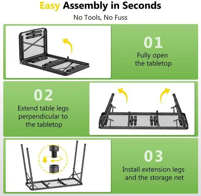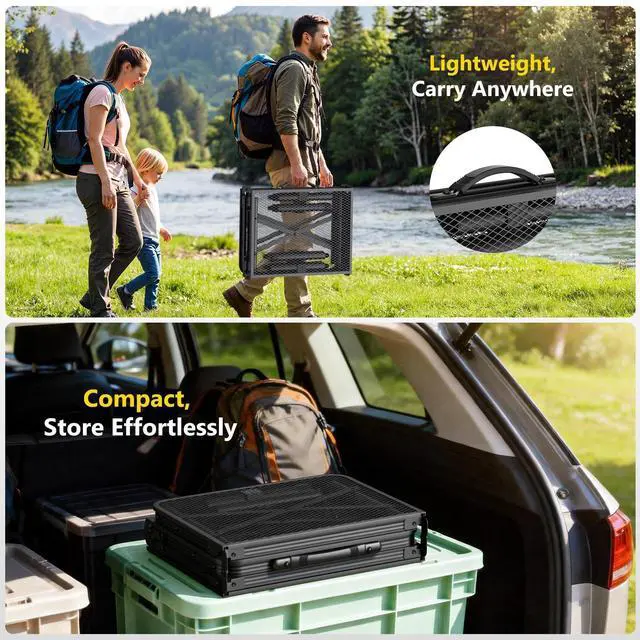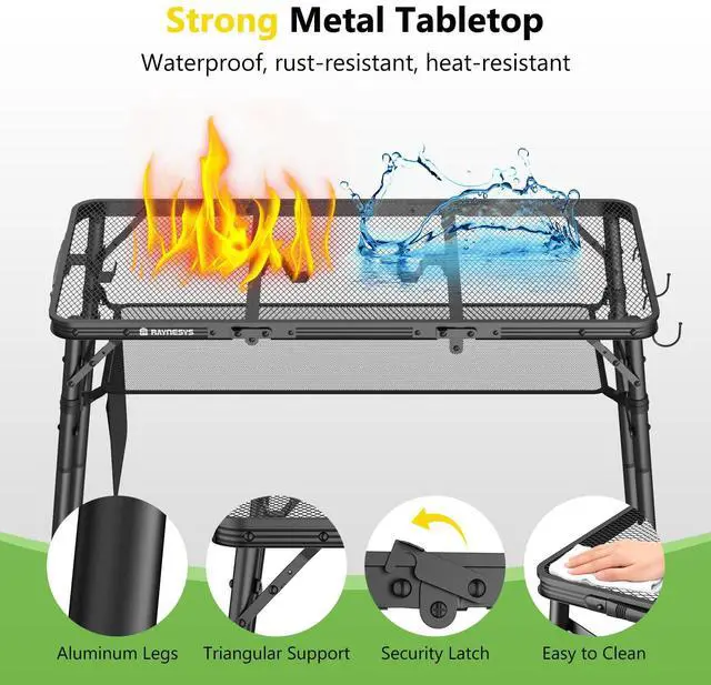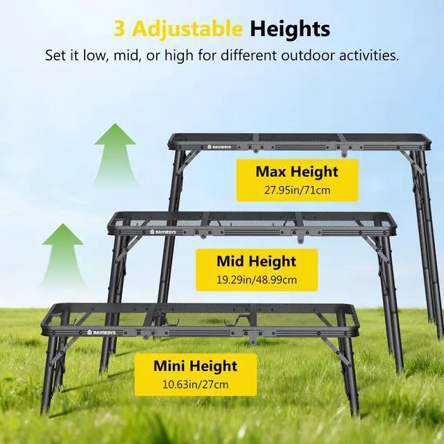 Built with a sturdy aluminum alloy frame and an iron mesh tabletop, the camp table is rust-resistant, corrosion-resistant, and easy to clean. The adjustable legs offer 3 height options (10.63/19.29/27.95 inches) to fit different activitiesfrom sitting down for a meal to standing while cooking. The foldable tabletop, detachable legs, and sturdy handle make storage and transport effortless. No tools are required for setup, so you can assemble it in minutes and enjoy more time outdoors. The package includes 1 x metal folding table, 8 x legs, and 1 x mesh bag with side pockets.