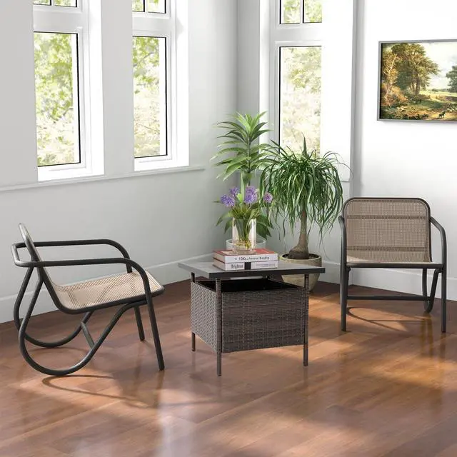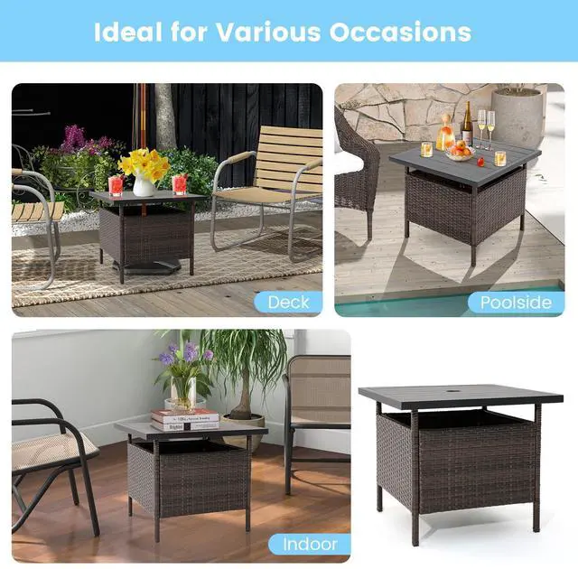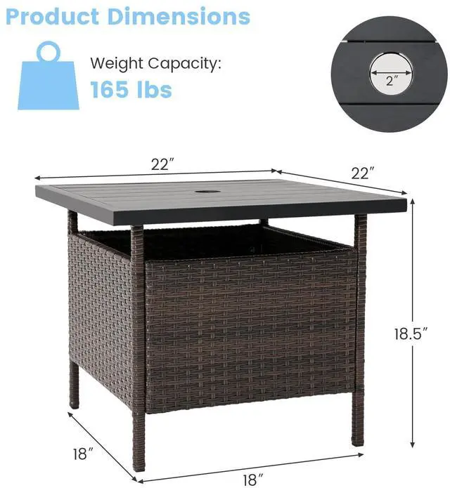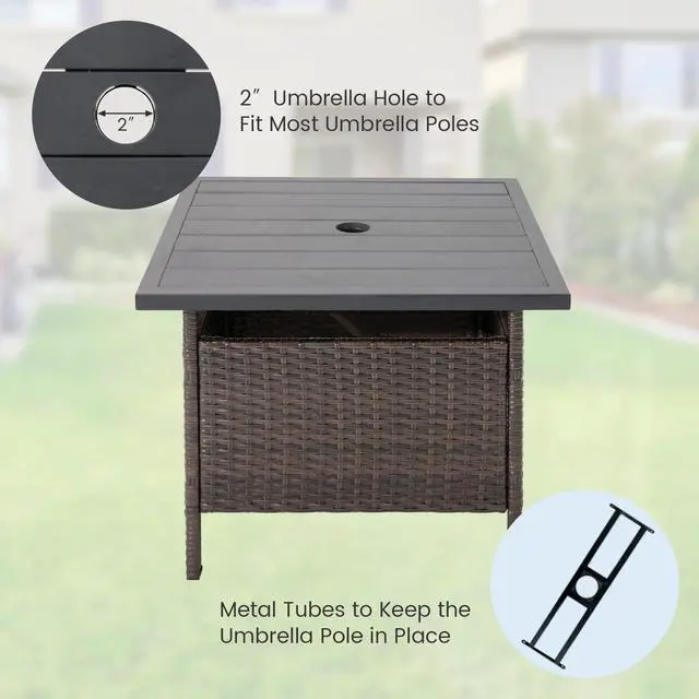Centered on a practical 2-inch steel-reinforced umbrella hole, this small patio table with umbrella hole easily adds shade on sunny days. The smooth desktop is made from high-performance, easy-clean HDPE. Non-slip caps on all four legs ensure safety and stability, while the fade-resistant gradient brown rattan weave maintains its look season after season. Built on a sturdy metal frame, this poolside umbrella table offers reliable daily use.