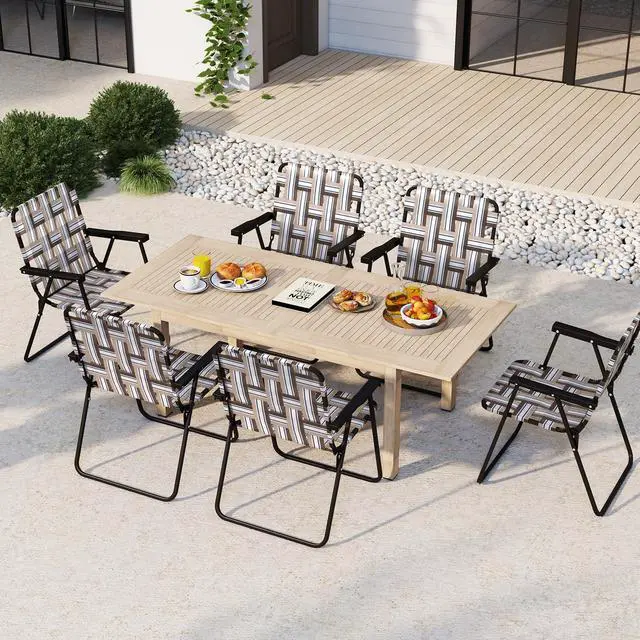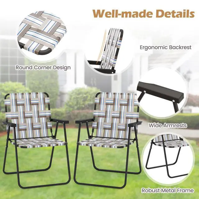 Main Built with long-lasting enjoyment and convenience in mind, our chairis portable and lightweight enough to bring anywhere yet durable enough towithstand frequent use. It has durablepowder-coated steel frame and high quality fade resistant webbing. Whetheryou set this chair up by the sea or by the backyard pool, it brings a brightnautical nod to any setting. Features Solid and reinforced steel frame with anti-rust coating, holds up to 330 lbs Made with high quality fade resistant webbing Great for outdoor concerts, festivals, the beach and parks Easy to set up and no tools required Portable design folds quickly and easily for simple transport and storage Include 6 chairs meet the needs of your family or collective activity Specifications Color : Red/Blue/Coffee Material : Steel,PE webbing Net weight : 7 lbs(1pc) Max load : 330 lbs Overall Dimension: 23" x 22.5" x 31"