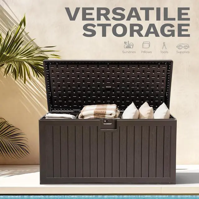 Versatile and Practical: More than just storage, this deck box doubles as an extra table or bench, seating up to six people with a weight capacity of 1000 lbs; It seamlessly blends into any yard or patio with spacious space for cushions, tools, supplies