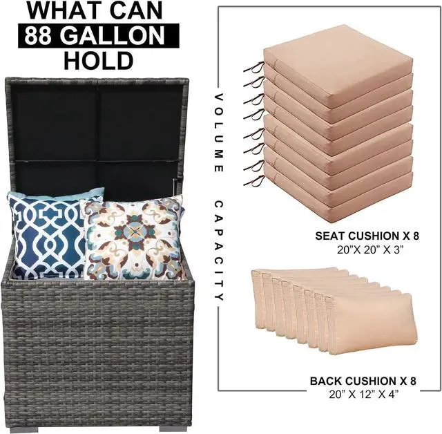 88 Gallon Storage Capacity: This patio storage box has a huge 88-gallon capacity, which provides plenty of space for storing cushions, pillows, garden tools and seasonal decorations for daily use. Plus, the lid of this outdoor cushion storage features a hydraulic lid piston system. It ensures a quiet and gentle daily opening and closing.