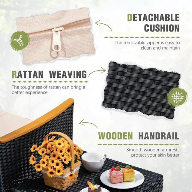 QUALITY AND DURABLE MATERIAL: This outdoor furniture set is made of thickened polyethylene rattan weave, which are UV, water and weather resistant for long life