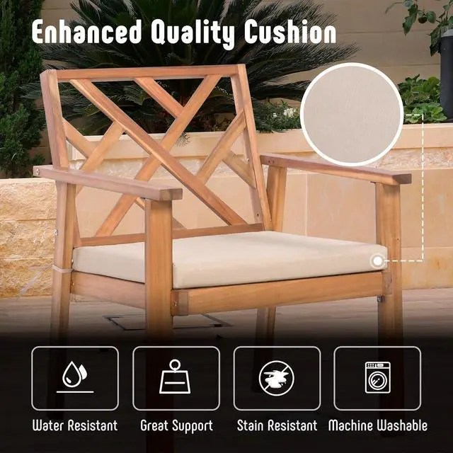 Versatile Seating Arrangement: This outdoor patio set includes two single chairs and a table, offering customizable arrangements for any occasion. Whether entertaining guests or enjoying a quiet evening, this elegant wood furniture enhances your outdoor living experience