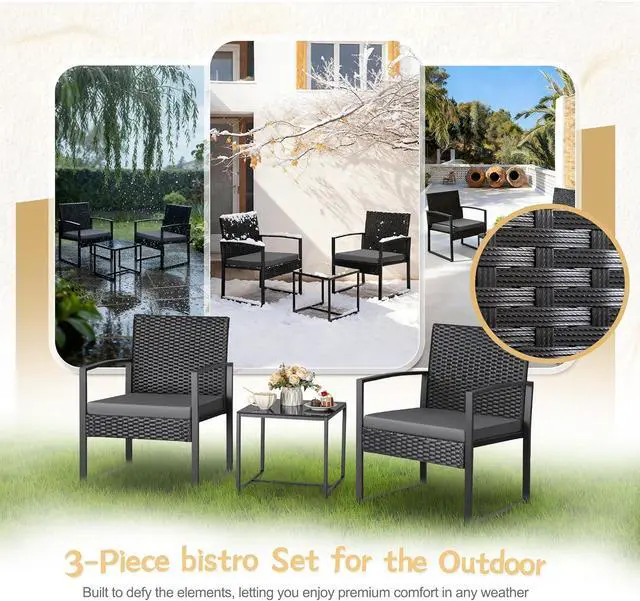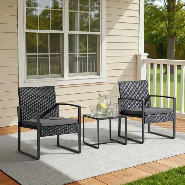 EASY TO CLEAN: The black polyester fiber cover on the cushion of the patio set can be easily removed and cleaned, and the tempered glass of the coffee table can be wiped clean of juice stains with just a piece of wet wipes
