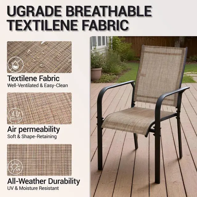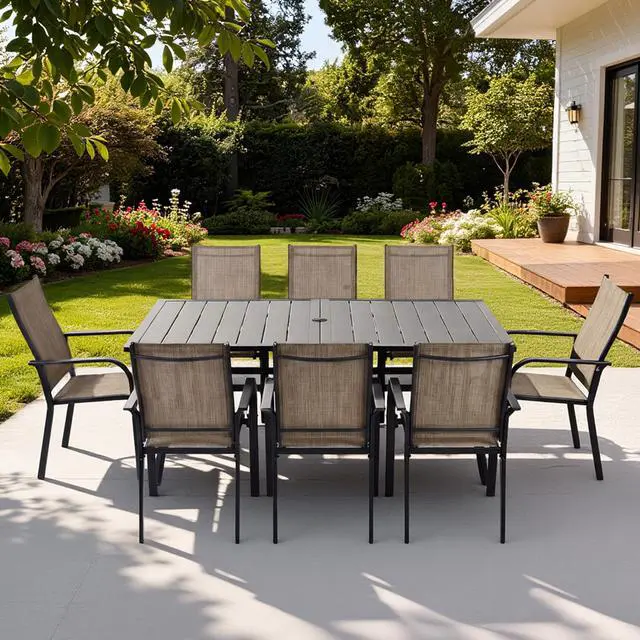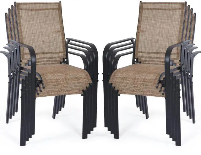 This set of 8 patio chairs combines sturdy construction with comfortable support to create a welcoming outdoor seating experience. Ideal for patios, porches, lawns, gardens, and balconies, these outdoor dining chairs offer reliable comfort and relaxed support for any setting.
