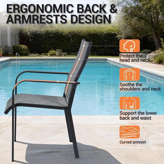 The heavy-duty steel frame with a durable powder-coated finish provides stable performance and reliable weather resistance for long-term outdoor use. Easy to assemble, these outdoor chairs work well as patio chairs, lawn chairs, porch chairs, or part of an outdoor dining set.