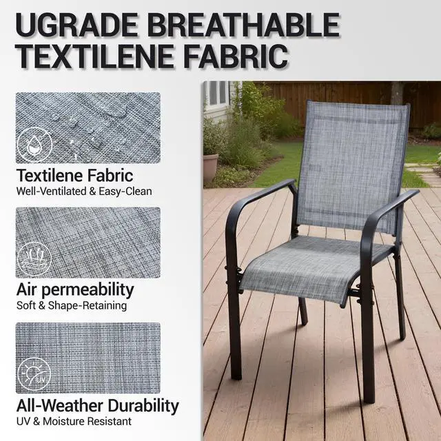 This set of 8 patio chairs combines sturdy construction with comfortable support to create a welcoming outdoor seating experience. Ideal for patios, porches, lawns, gardens, and balconies, these outdoor dining chairs offer reliable comfort and relaxed support for any setting.