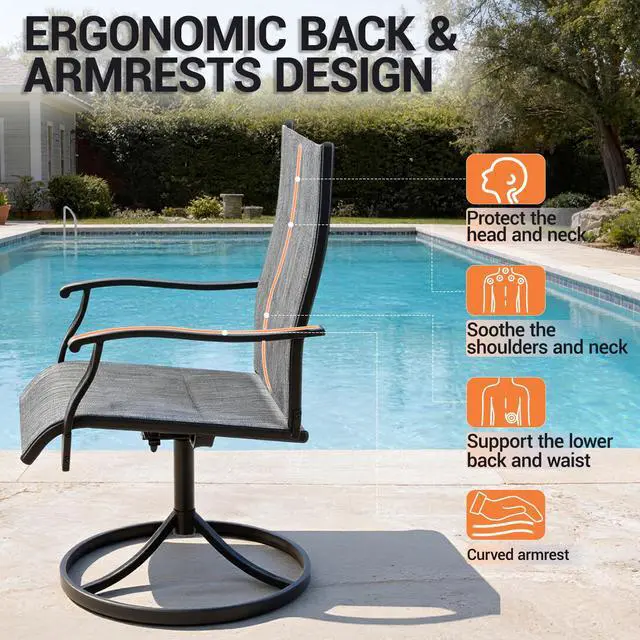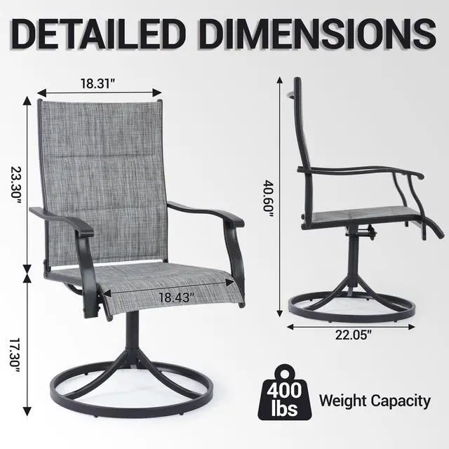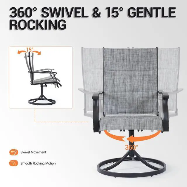 • 360° Swivel & 15° Rocking Chairs: Enjoy smooth 360° rotation and gentle 15° rocking for effortless movement and enhanced comfort. These functional patio swivel chairs let you relax in any preferred posture during outdoor leisure.