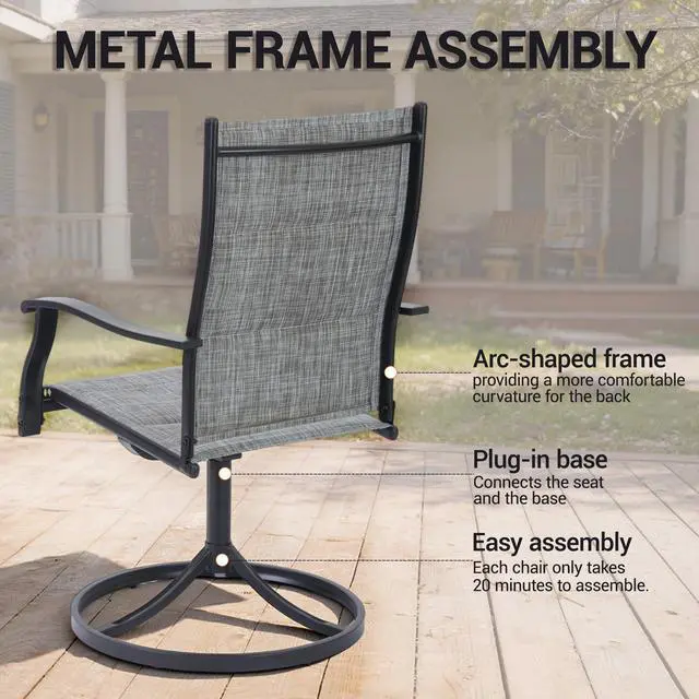 The heavy-duty steel frame with a durable powder-coated finish provides stable performance and reliable weather resistance for long-term outdoor use. Easy to assemble, these swivel rocker chairs work well as patio chairs, lawn chairs, porch chairs, or part of an outdoor dining set.