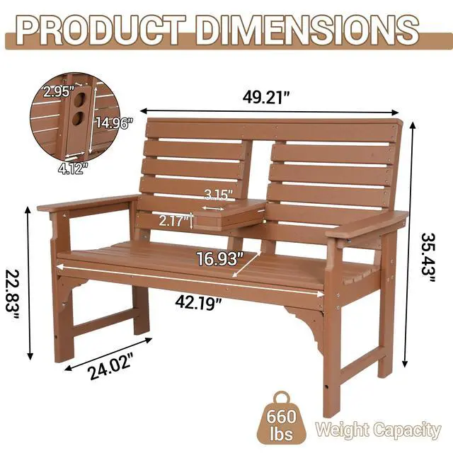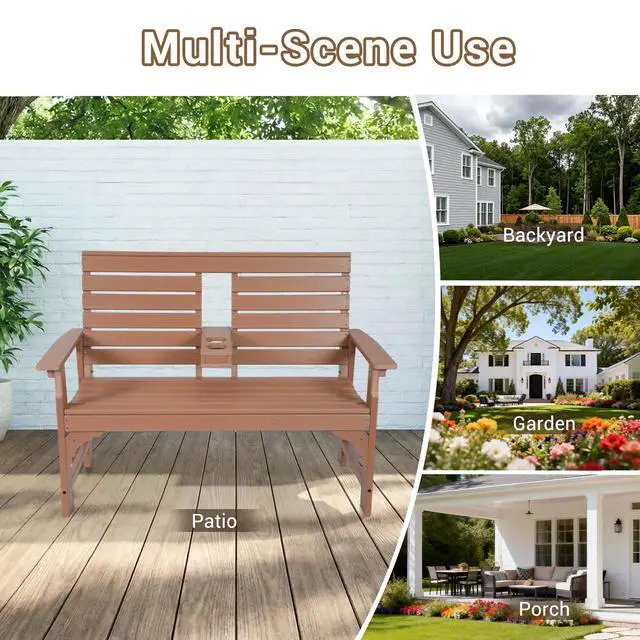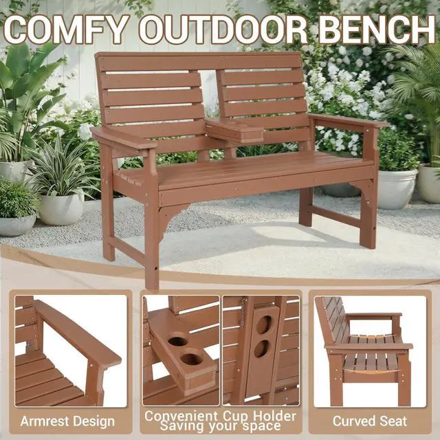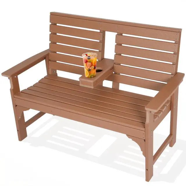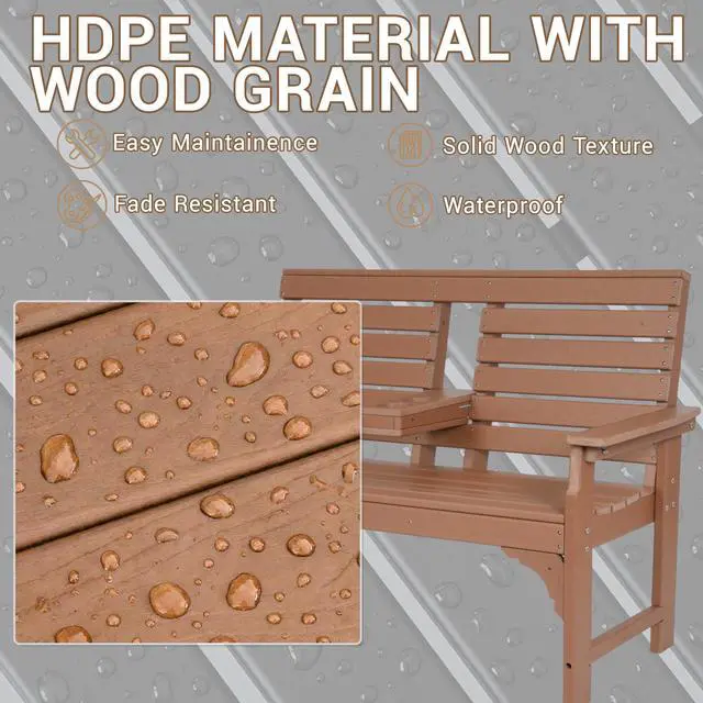 This 2-seat outdoor bench brings enduring comfort and style to any outdoor setting. Crafted from HDPE, it stands up to sun, rain, and changing seasons without rotting, fading, or requiring constant upkeep. A simple rinse with water or a wipe with a cloth is all it needs to stay looking fresh.