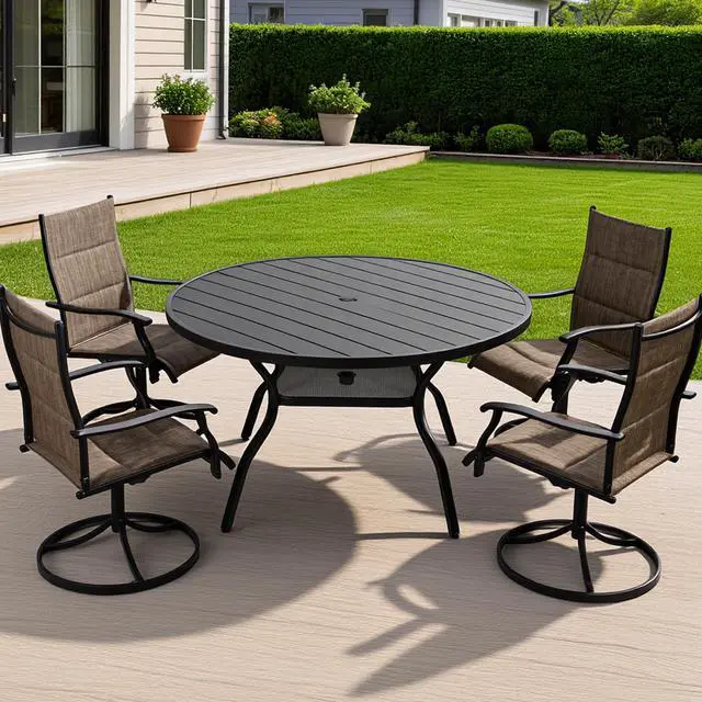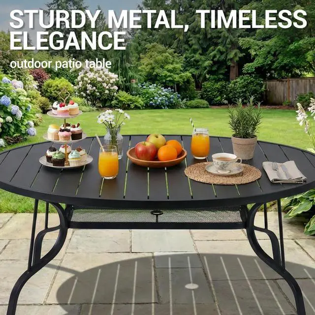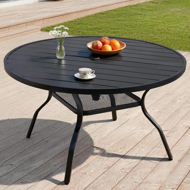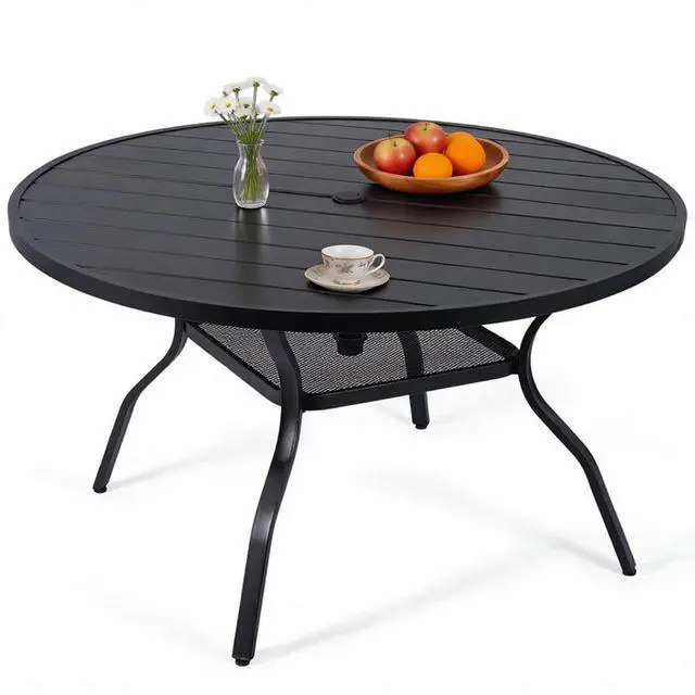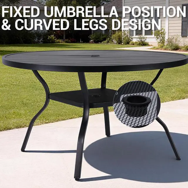 The slatted tabletop helps water drain quickly after rain, and the smooth metal surface is easy to wipe clean. An Adjustable umbrella hole at the center allows you to pair the table with most outdoor umbrellas for shade during sunny or rainy days, making it a practical umbrella table for various outdoor settings.
